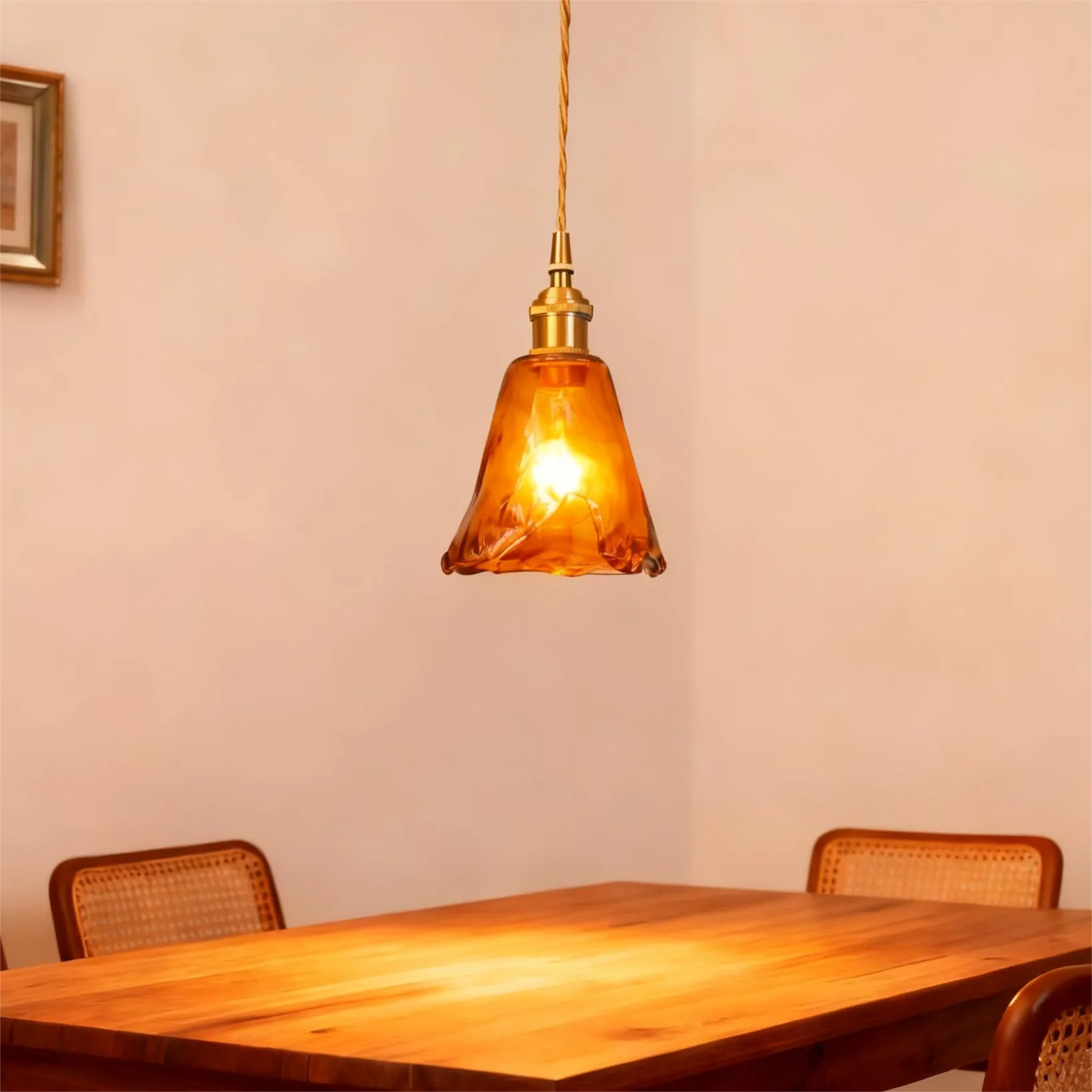 Expertly crafted from durable brass, this pendant light offers superior longevity and classic appeal. The amber glass shade casts a warm, inviting glow, infusing your space with a sense of tranquility and sophistication. Perfect for those seeking a blend of vintage style and modern functionality, it not only enhances your dining area with its aesthetic beauty but also provides ambient lighting that promotes a relaxing atmosphere during meals or gatherings.