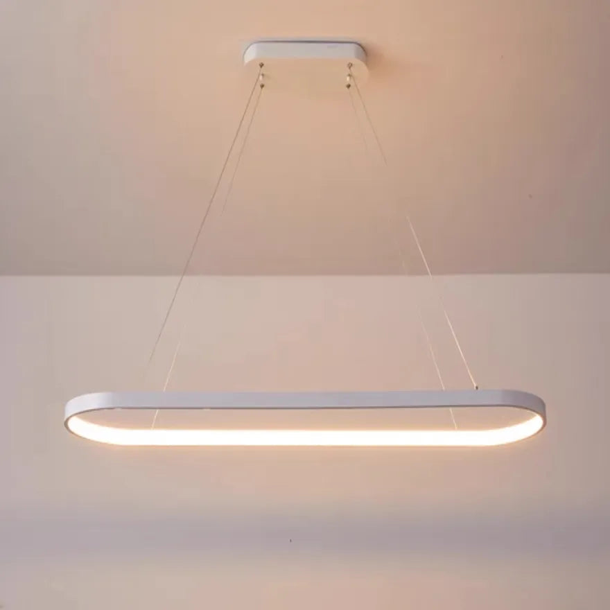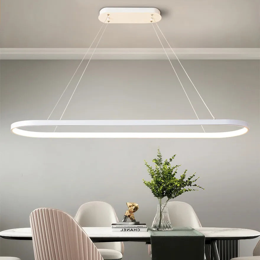 Elevate your dining room with this stylish modern oval ring led pendant light. Crafted from high-quality aluminum metal for durability, with an inner silicone ring lampshade that provides a soft, warm glow and reduces flicker.The adjustable brightness feature allows you to easily create the perfect ambiance, from warm and intimate to bright and inviting.