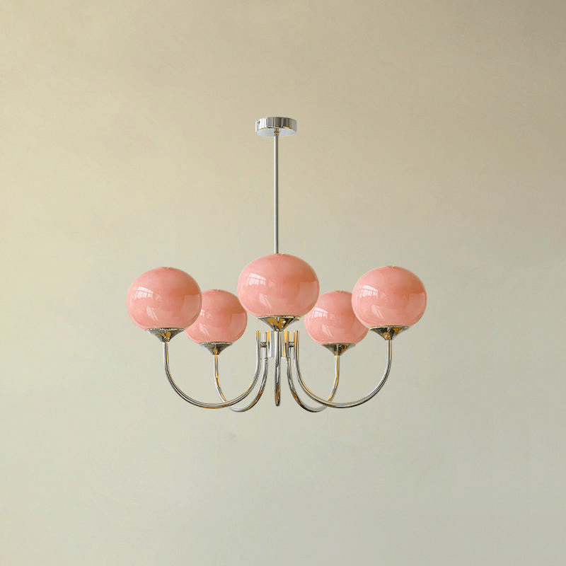 This stylish chandelier with a gold finish and soft pink glass shades will add a touch of timeless glamour to your home, its sweety colorway and funky design make this a statement piece, and matching family items are available to help co-ordinate your home, to give the dream look.