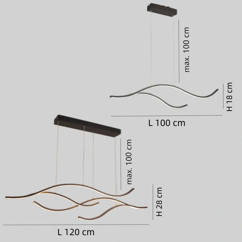 This Wave Light Pendant combines modern design with functional LED technology, perfect for dining rooms or kitchen islands. Available in black and gold, with lengths of 100cm and 120cm, it features dimmable, adjustable LED lighting with low blue light for a soft, glare-free ambiance. The high-quality painted aluminum body and transparent silicone diffuser ensure long-lasting, comfortable illumination. CE certified for safety.