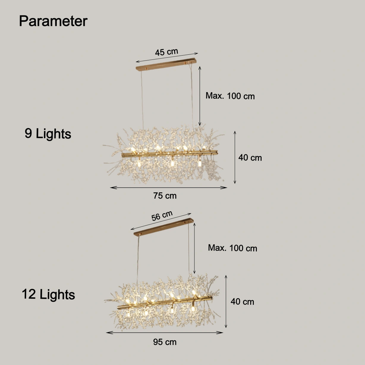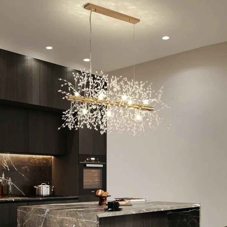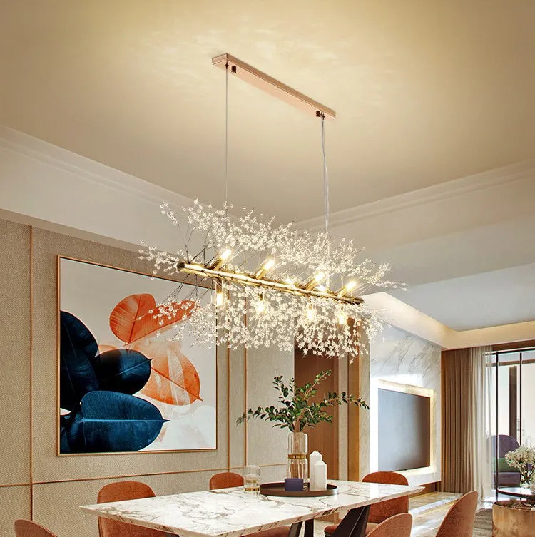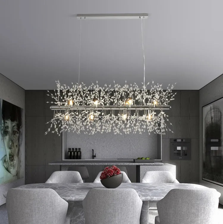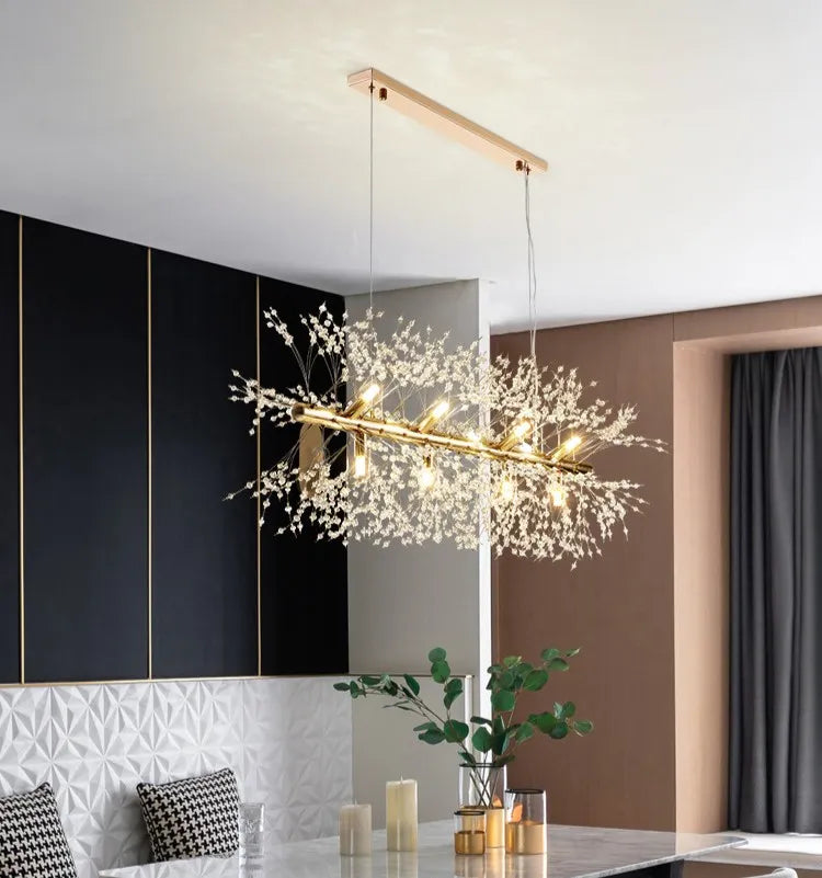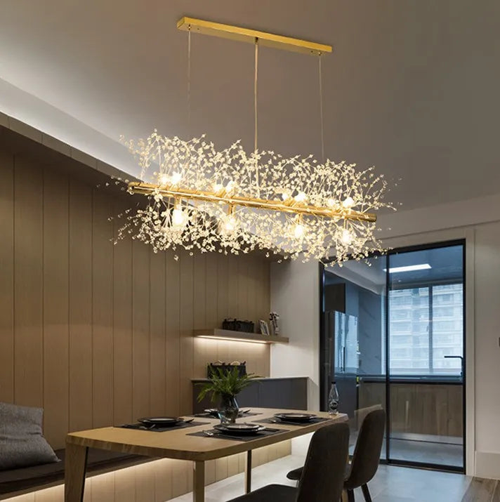 Bring a touch of romance to your dining room with the Romantic Dandelion Crystal Linear Chandelier. This chandelier combines high-quality iron and crystal to create a stunning display. The delicate crystal spheres emit a warm, inviting glow, while G9 bulbs offer energy efficiency. The iron frame ensures durability, with resistance to rust and corrosion.