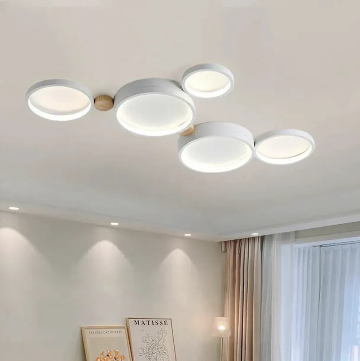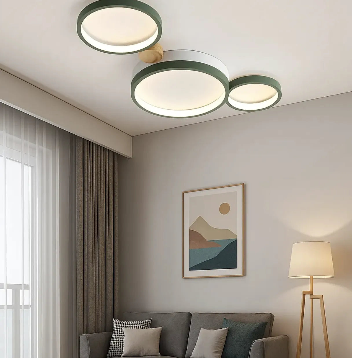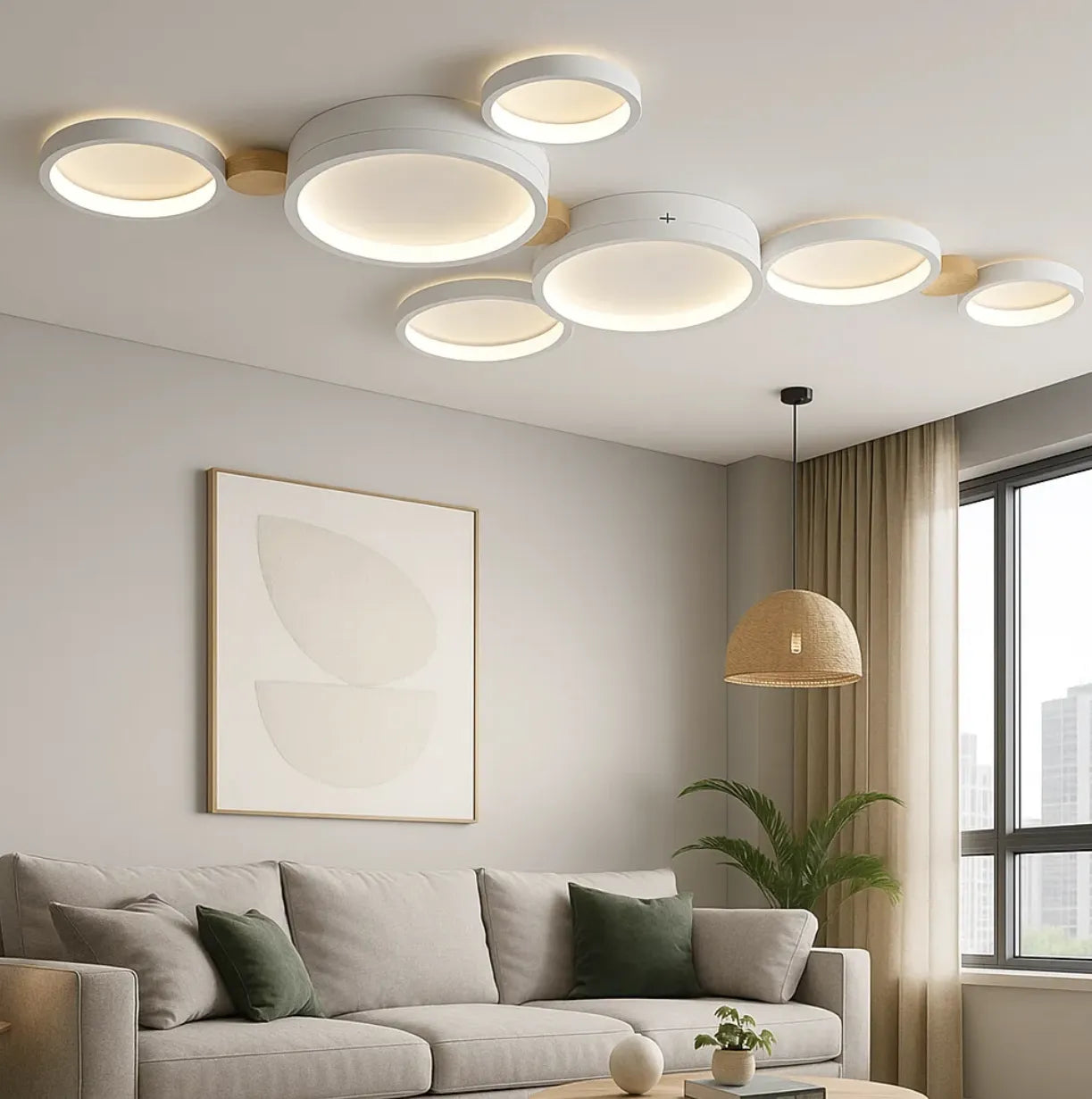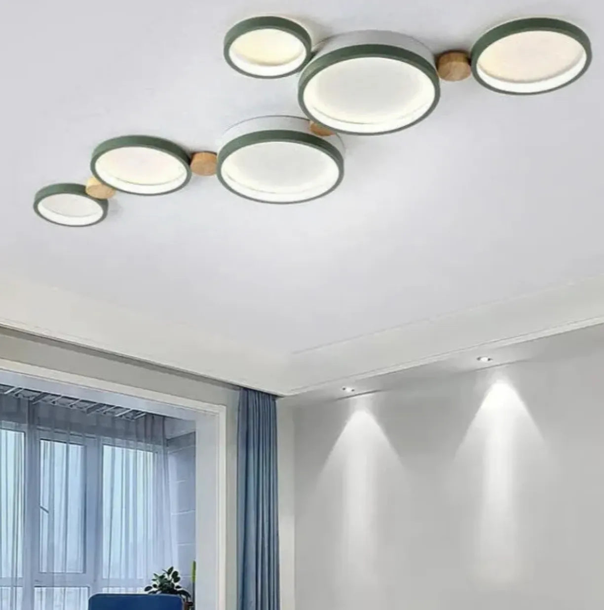 This Nordic LED Ceiling Light Fixture adds a modern touch to your living room with its multi-ring design. Crafted from high-quality iron and finished with a smooth matte surface, it features natural rubber wood accents that enhance its natural texture. The soft light protects the eyes, reduces flicker, and minimizes blue light hazards, creating a soothing relax environment.