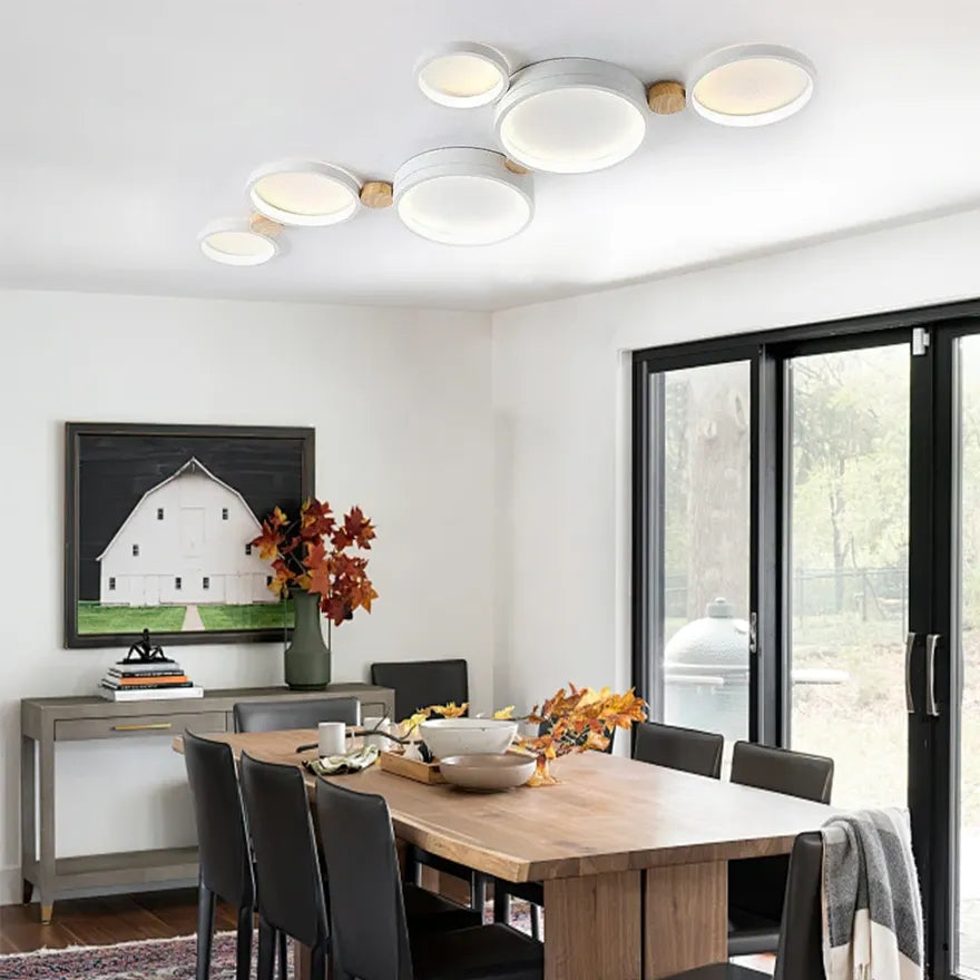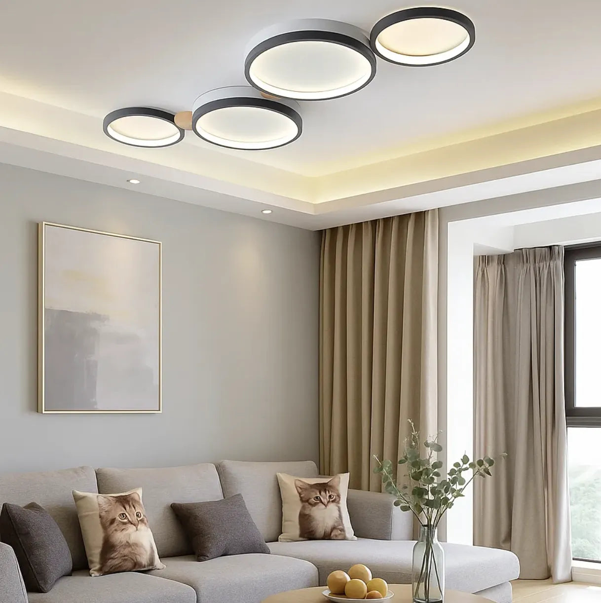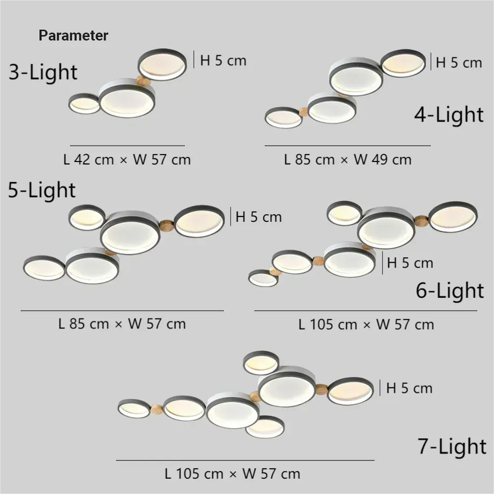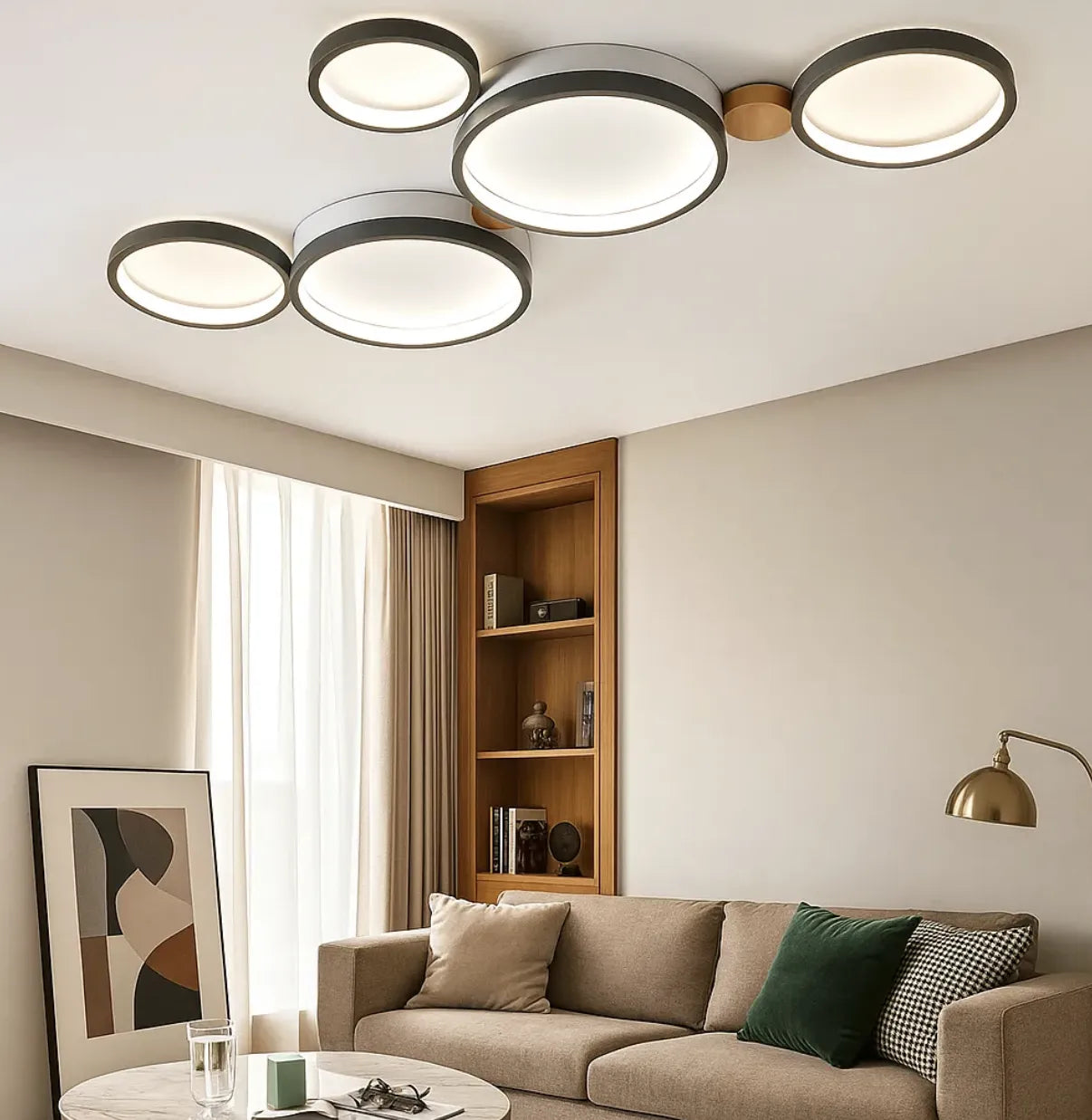 This Nordic LED Ceiling Light Fixture adds a modern touch to your living room with its multi-ring design. Crafted from high-quality iron and finished with a smooth matte surface, it features natural rubber wood accents that enhance its natural texture. The soft light protects the eyes, reduces flicker, and minimizes blue light hazards, creating a soothing relax environment.