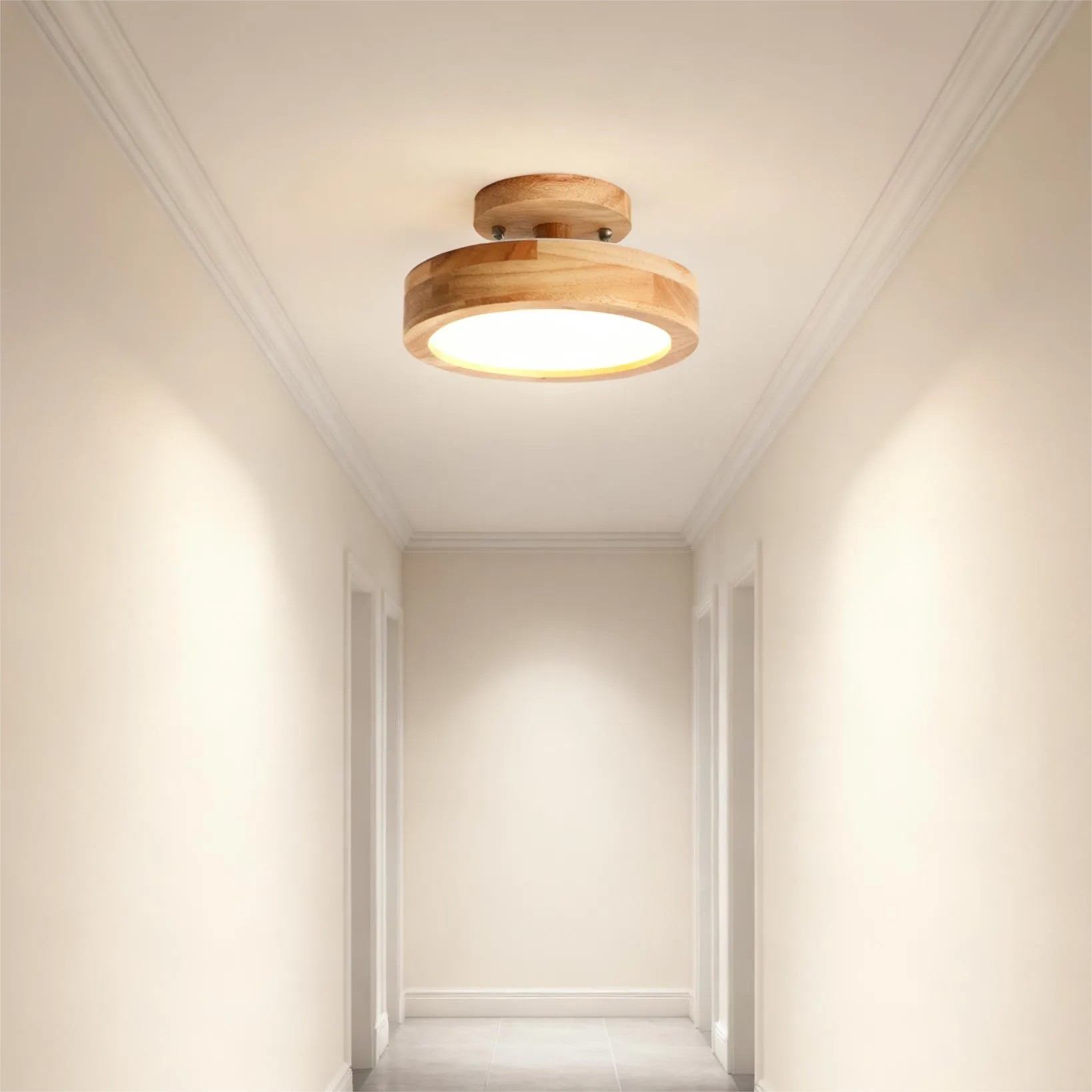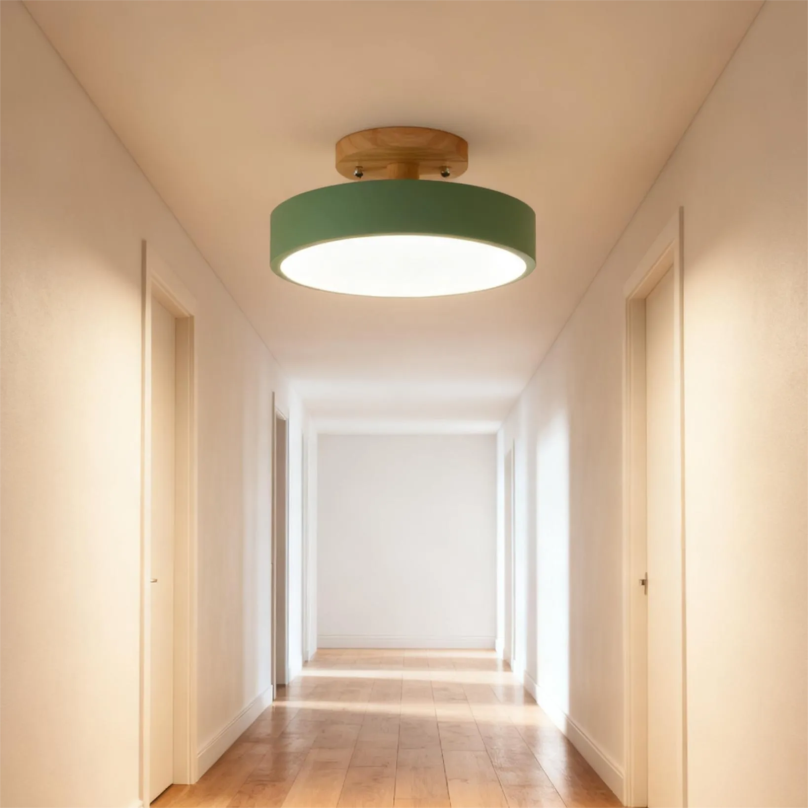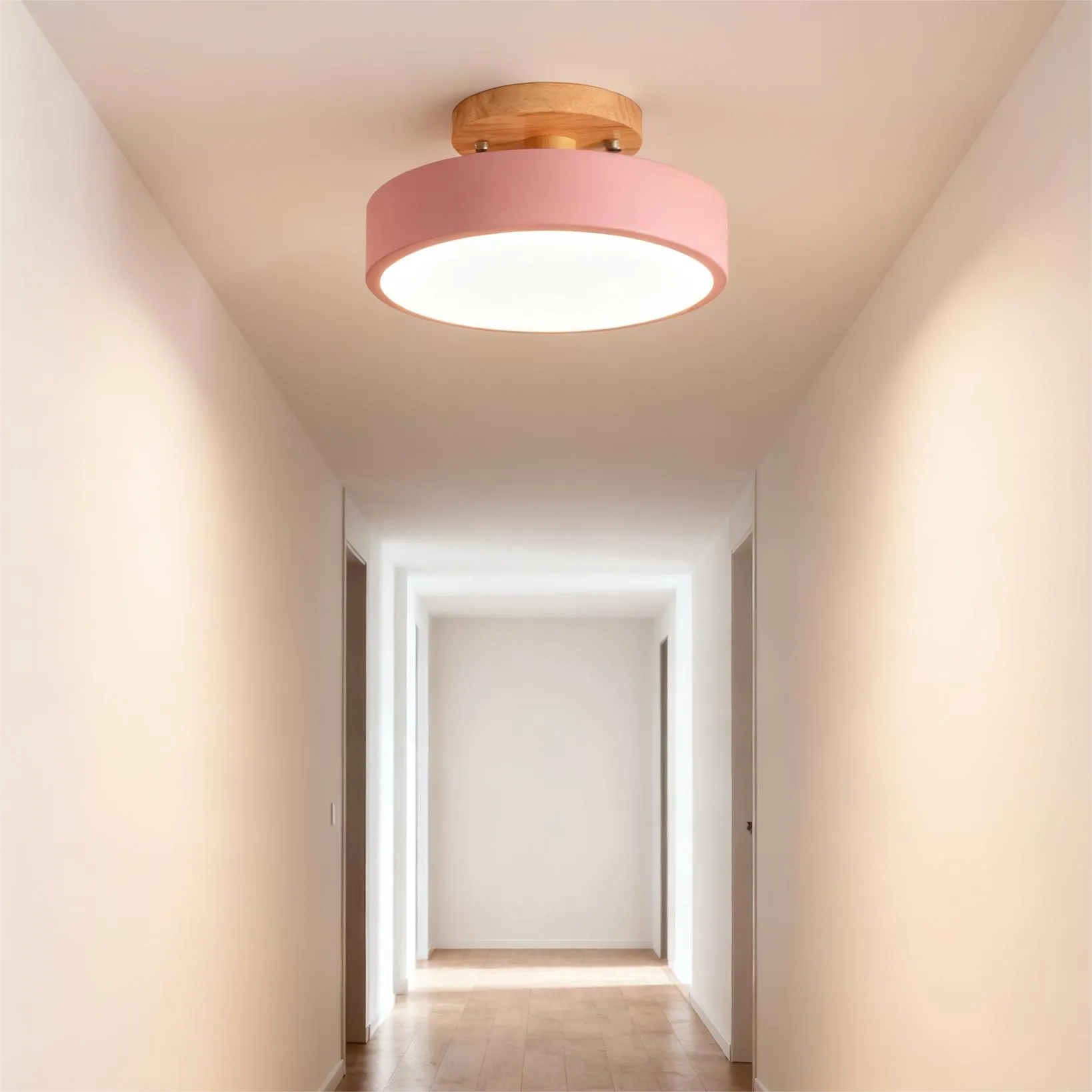 Elevate your hallway with this Nordic LED ceiling light featuring a natural wood base that adds warmth and eco-conscious charm. The round iron metal shade ensures long-lasting durability, while the acrylic diffuser softens the light for a cozy glow. With three adjustable color—warm, neutral, and cool—it effortlessly adapts to different times of day and ambiance needs.