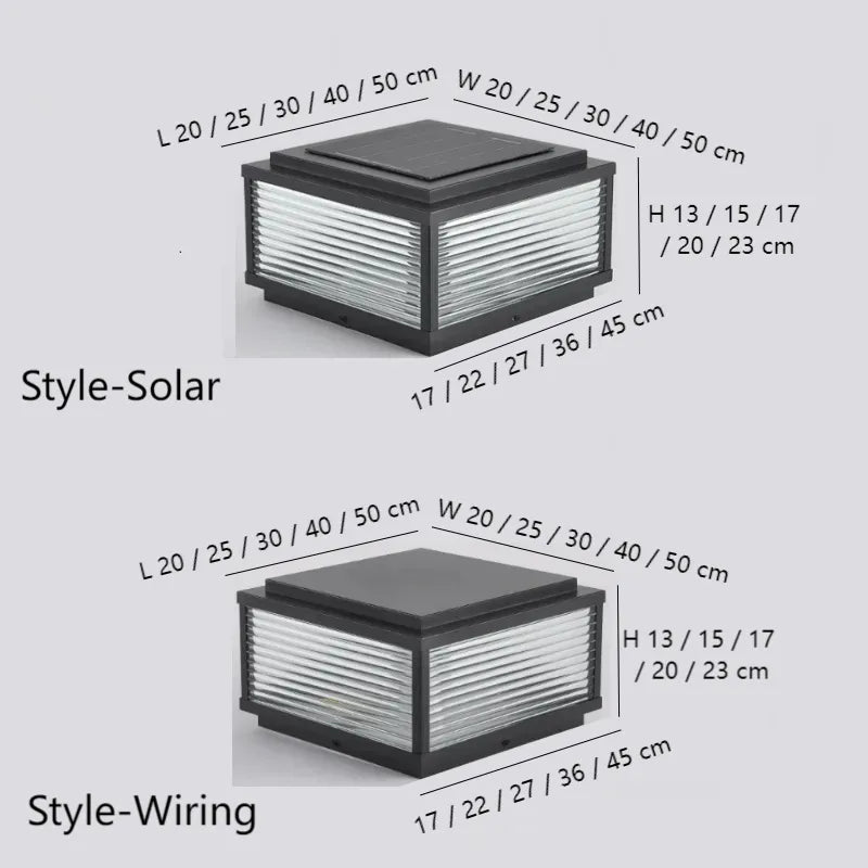 These solar garden pillar light offer a modern and practical lighting solution for outdoor spaces. Available in solar and wired versions, with heights of 20, 25, 30, 40 and 50cm, they are crafted from durable metal and reinforced glass. Featuring energy-efficient LED lighting, IP65 waterproof and dustproof protection, they are built to withstand harsh weather conditions. Ideal for gardens and pathways, and CE certified for safety and reliability.