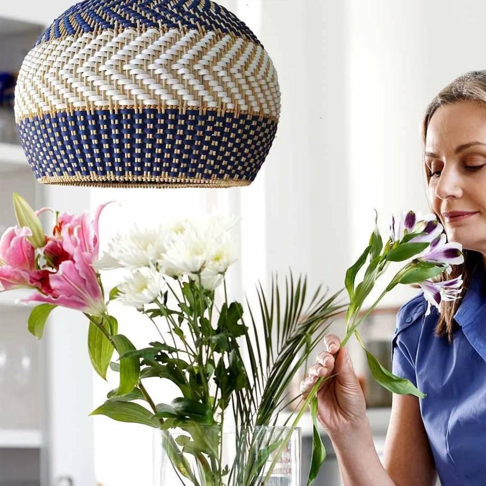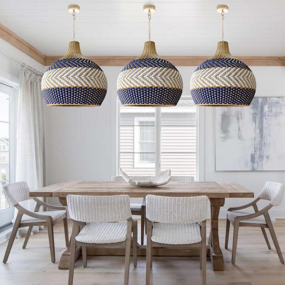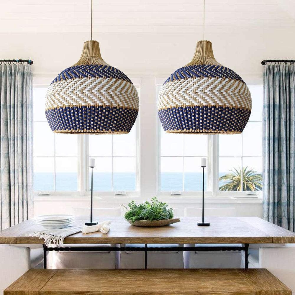 Hand-woven with a herringbone pattern in blue and white. Bamboo light fixtures and rattan pendant lights are popular with blue hanging lights. A Scandinavian or Japanese design. Gorgeous lighting for restaurants, beach bars, hotels, cafes with an eclectic industrial design, business lighting, and vacation houses along the coast. It's a great way to incorporate natural materials with vintage style and bring the outdoors indoors.